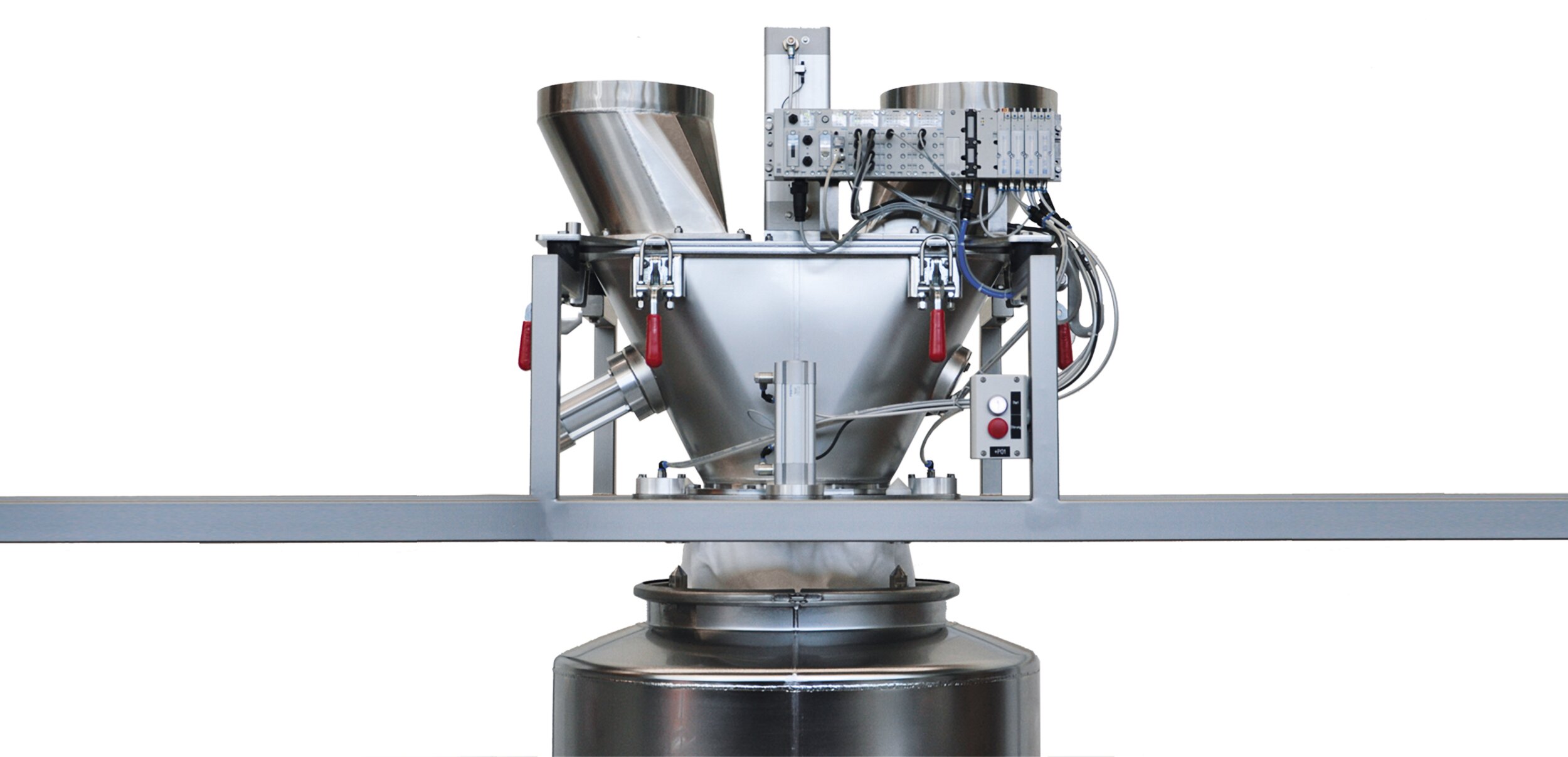 放在秤上的容器(例如 BATCHTAINER®、桶、集装箱)被定位在规定的配量站下方。然后,被动件的联接板被主动件的夹持器提起并对中。如果要在容器中进行称重,就会扣除秤的皮重。然后,AZO CleanDock® 打开通道,即可在容器中进行产品的配量。